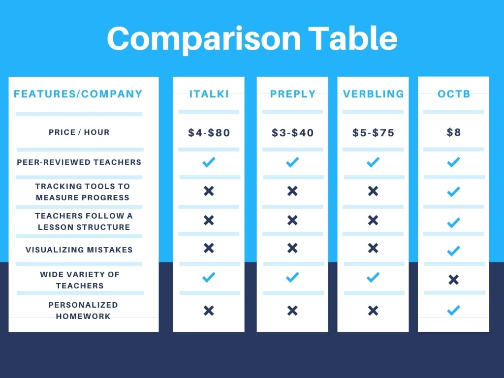 👍 PROS: The price is only $8/hour. They only accept native speaking teachers who go through a teacher training. The teachers follow a curriculum and use the OCTB platform, which allows students to visualize their mistakes in real time during the class. These mistakes are then turned into personalized homework. The platform also tracks students' progress on a lesson-by-lesson basis.
